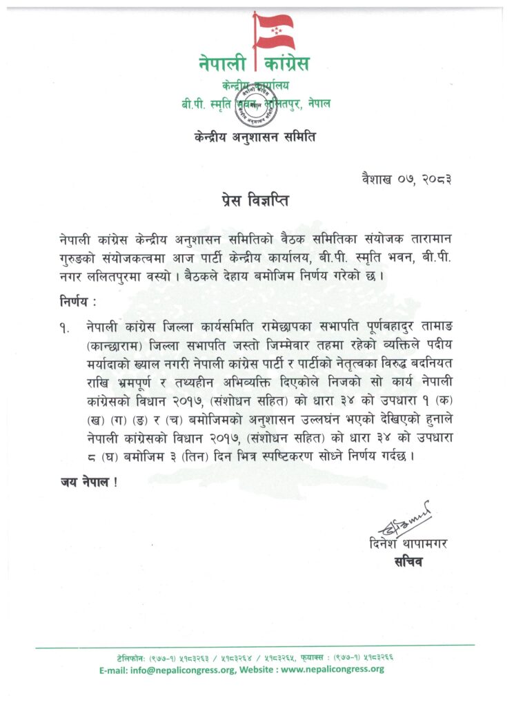 ७ वैशाख, काठमाडौं । नेपाली कांग्रेसले जिल्ला कार्यसमिति रामेछापका सभापति पूर्णबहादुर तामाङ (कान्छाराम)लाई तीन दिने स्पष्टीकरण सोधेको छ ।